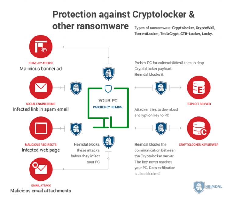 Heimdal offers protection where other antivirus products give up – offering Attack blocking, Exploit blocking, Patching, Dropper protection, or key delivery filtering. Ransomware infections can happen either via vulnerabilities or via exploits delivered from legitimate website banners and go undetected by traditional antivirus products.