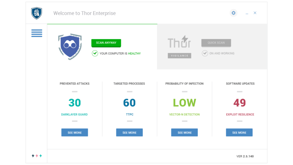 Thor Vigilance Enterprise combines the techniques known by both traditional and next-gen antivirus engines to offer market-leading mitigation and 100% detection. Enjoy security, compliance and convenience with unparalleled detection. Thor Vigilance Enterprise offers effective access to intelligence, enabling you to execute a large number of policies.