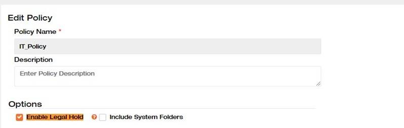 Litigation Hold: BluVault Home > Policy Management > Advanced > Options > Enable Legal Hold