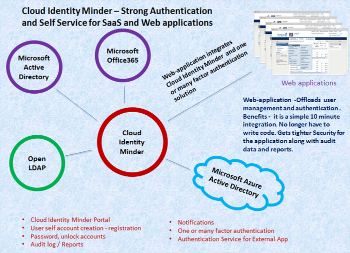 Cloud Identity Minder is a cloud-based identity, authentication, and self-service user life cycle management solution. Azure Active Directory (Azure ad) & OpenLDAP management tool make your application work with any Identity store located anywhere with simple and easy integration to your SaaS, web, or traditional application. You no longer need to add a special code for each Identity store. The solution provides auditing and workflow as well. Additionally, the application doesn’t need to be aware of the Identity store thereby allowing Identities to stay within the confinement of the existing location (on-premise or cloud). The solution can be deployed in enterprise DMZ or in the cloud.