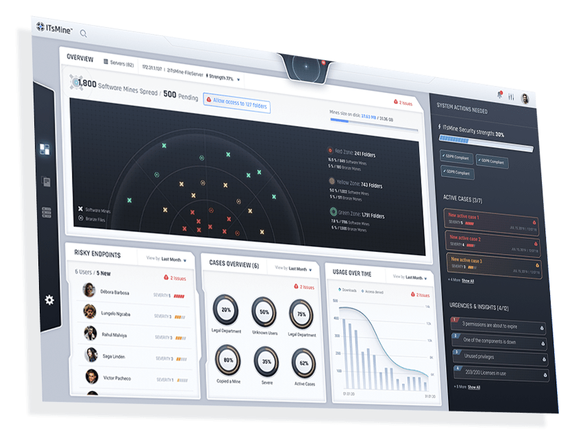 ITsMine is a leading solution used by organizations to protect against internal and external threats automatically. ITsMine takes a proactive approach to protecting data within company boundaries and beyond. ITsMine is Agentless and very easy to implement (takes less than a day), does not require additional headcount due to AI and deception techniques used, has a built-in automatic reaction for both Internal and External threats, and can turn any folder into the most secured folder, whether on-premise or in the cloud.