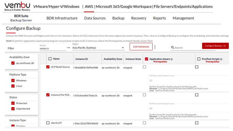 Vembu BDR Suite performs agentless backups of your AWS EC2 instances by leveraging Amazon APIs. You can schedule backups of the instances running in any AWS Account and region and when required.